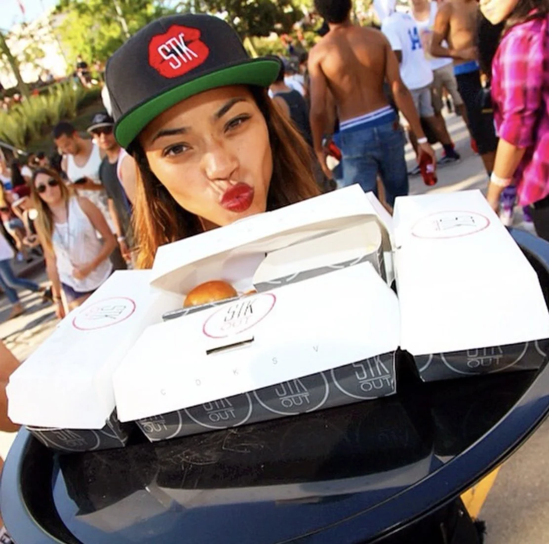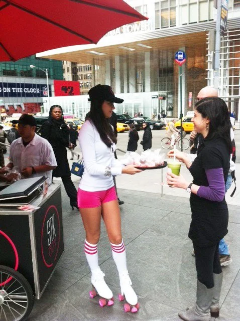 As an extension of it’s brand, the trendy steakhouse STK opened a kiosk in Bryant Park called STK OUT, serving a take-away only menu. For it’s grand opening event, servers/promo models on roller skates in hot pink shorts, matching the logo colors, offered up the signature wagyu beef Lil’ Brgs to guests and signature sweets from the STK OUT branded ice cream cart while guests enjoyed music by DJ Martial. STK branded swag was given to guests as well as loyalty cards that they can use when they visit to receive a free shake.